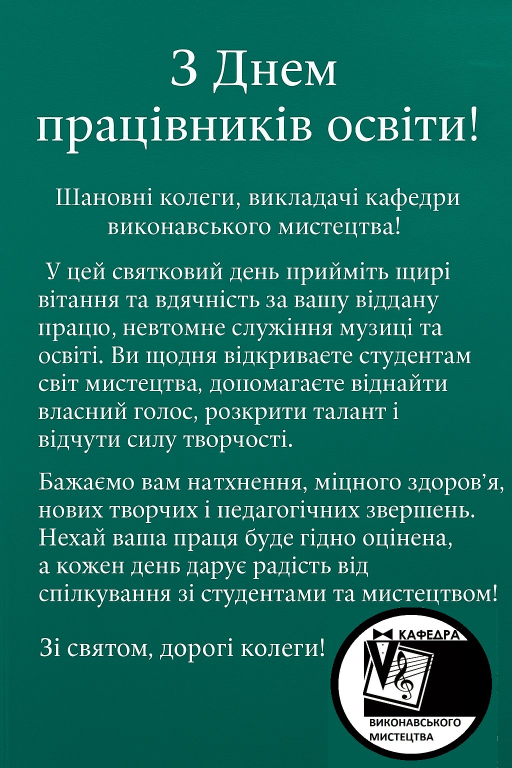 У цей святковий день ми бажаємо всій нашій творчій спільноті, професорам, концертмейстерам, студентам, магістрантам та випускникам, невичерпного натхнення, сміливих експериментів та вдячних слухачів. Нехай музика, що народжується в стінах нашої кафедри, завжди буде джерелом світла, надії та духовної сили.
